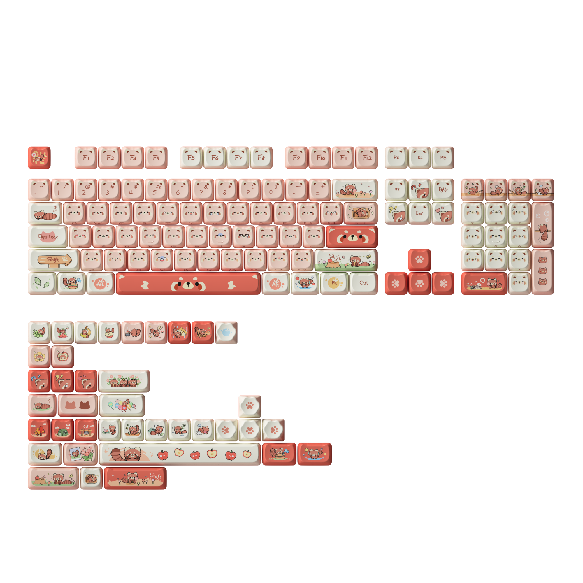 Mỗi keycap là sự khắc họa hình ảnh cute của chú gấu mèo bắc mỹ . Bạn sẽ cảm thấy vui tươi và đầy hứng khởi khi chạm vào chúng .