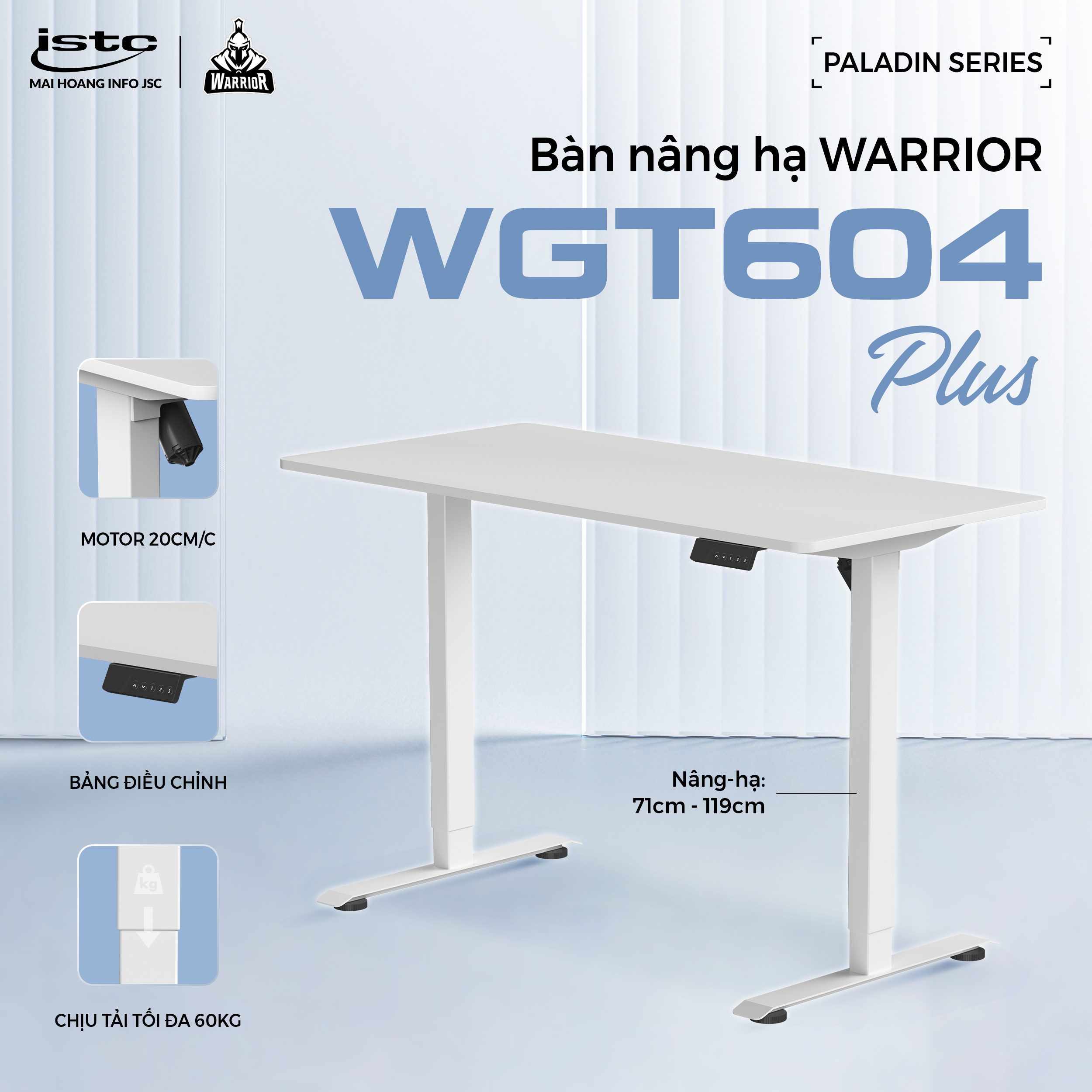 Bàn nâng hạ điện WARRIOR WGT604 Plus sở hữu mặt bàn hai mảnh làm từ chất liệu Particle Board P2PB dày 16mm, bền chắc và chống cong vênh. Với hai tông màu Trắng – Đen sang trọng, sản phẩm phù hợp với mọi không gian làm việc từ văn phòng đến gia đình. Chân bàn bằng hợp kim hình chữ T vững chãi, nâng đỡ tối ưu và tăng tính thẩm mỹ.