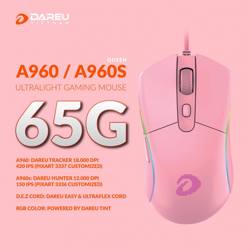 Chuột Gaming DAREU A960s QUEEN - ULTRALIGHT (HUNTER PWM3336, LED RGB)